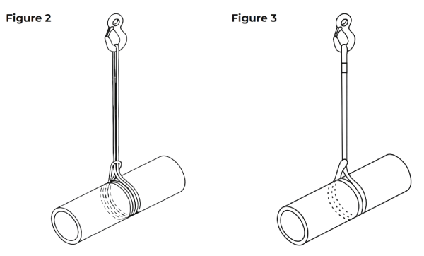 3.8 The load should be secured by the sling(s) in such a manner that it cannot topple or fall out of the sling(s) during the lift. Sling(s) should be arranged so that the point of lift is directly above the centre of gravity and the load is balanced and stable. Movement of the sling over the lifting point is possible if the centre of gravity of the load is not below the lifting point. When using basket hitch, the load should be secure since there is no gripping action as with choke hitch and the sling can roll through the lifting point. For slings which are used in pairs, the use of a spreader is recommended so that the sling legs hang as vertically as possible and to ensure that the load is equally divided between the legs. When a sling is used in choke hitch, it should be positioned so as to allow the natural (120°) angle to form and avoid heat being generated by friction. A sling should never be forced into position nor an attempt made to tighten the bite. The correct method of securing a load in a double choke hitch is illustrated in figure 2 (roundsling) and 3 (webbing slings) double choke hitch provides greater security and helps to prevent the load sliding through the sling.
